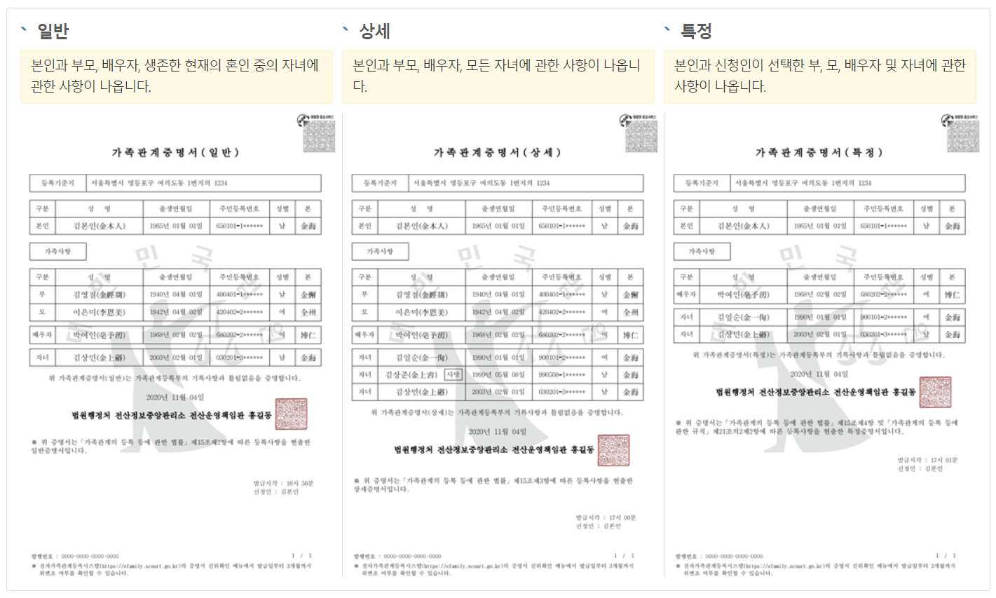 가족관계증명서는 다음과 같이 일반, 상세, 특정으로 나누어 발급이 가능하니 필요한 사항을 잘 확인하신 후 발급신청하시기 바랍니다.