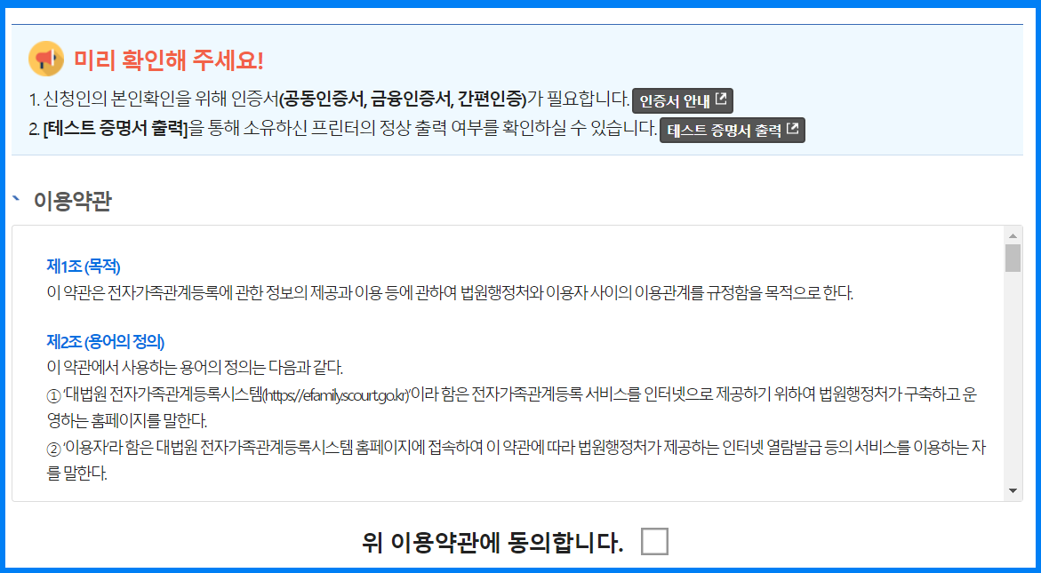 ① 위 사이트에서 증명서 발급 -> 가족관계증명서를 클릭한 후 이용약관에 동의합니다.