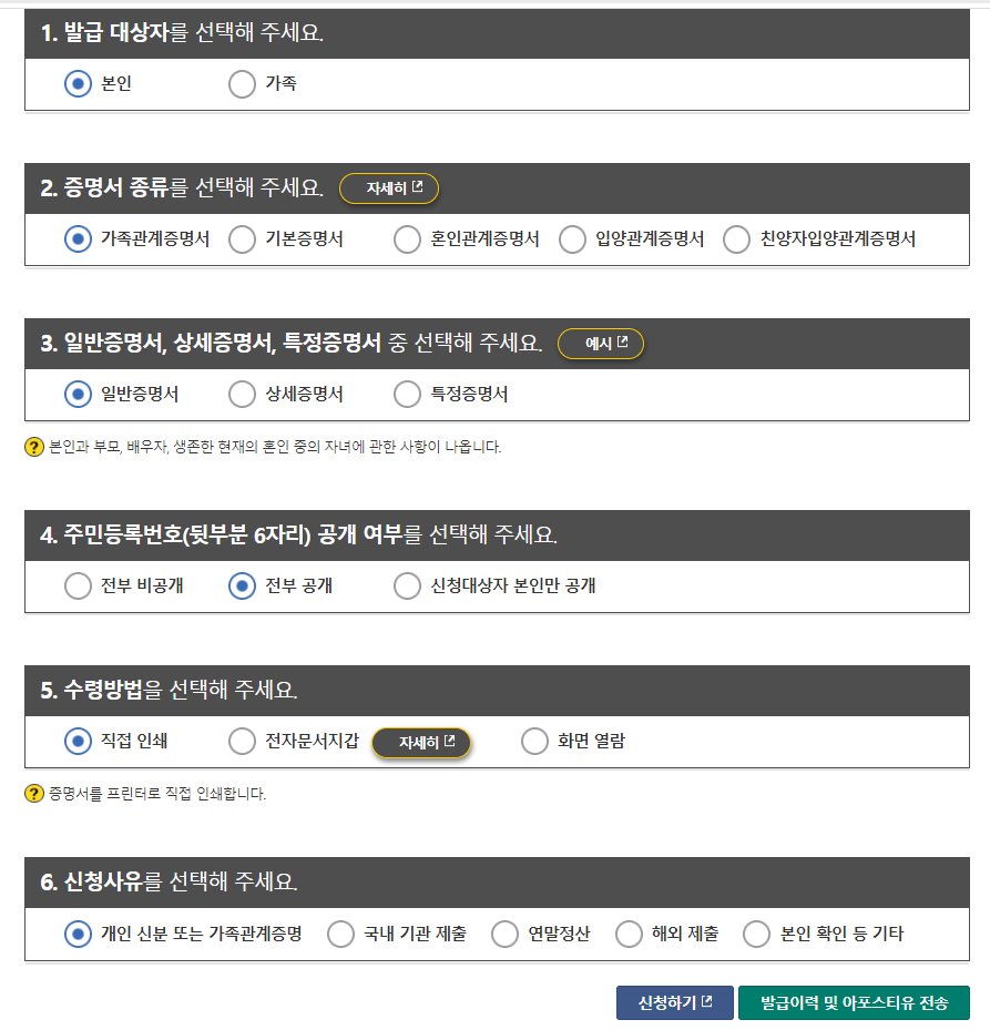 참고로 증명서를 제출용으로 발급받고자 하는 경우에는 제출기관(예: 관공서, 회사, 은행 등)에 필요한 증명서의 종류를 미리 확인한 수 발급받으시기 바랍니다.