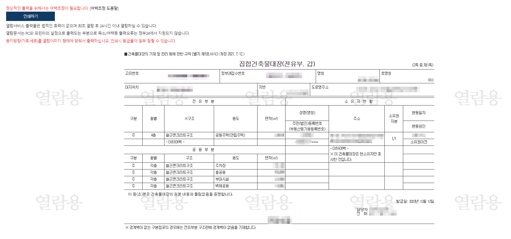 ⑥ 아래와 같이 신청한 건축물대장을 열람하여 인쇄 및 PDF 저장하여 필요 시 확인 또는 추가 인쇄를 할 수 있습니다.