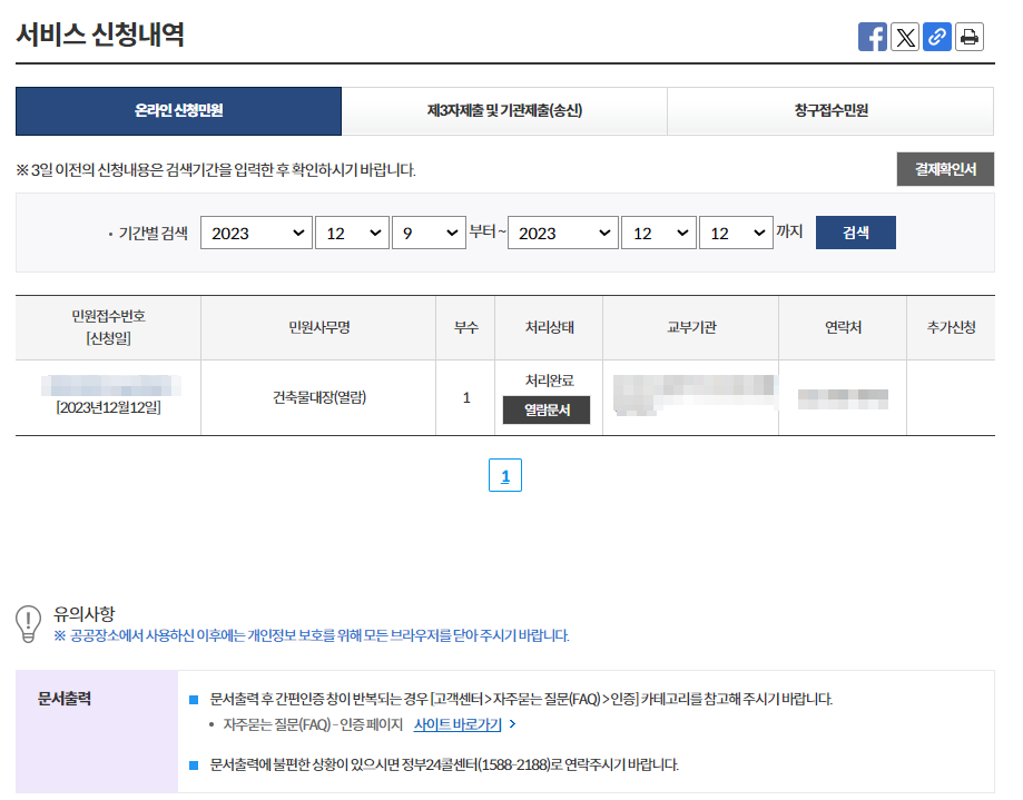 ⑤ 신청이 완료되면 아래와 같이 처리완료와 더불어 열람문서를 클릭하여 건축물대장을 열람할 수 있습니다.