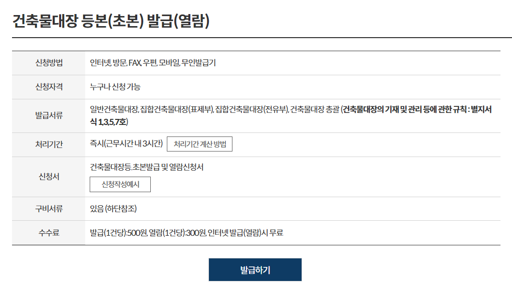 직접 방문하여 신청하면 발급은 건당 500원, 열람은 건당 300원의 발급수수료를 지불해야 하지만 정부 24 사이트에서는 무료 발급 및 열람이 가능합니다.