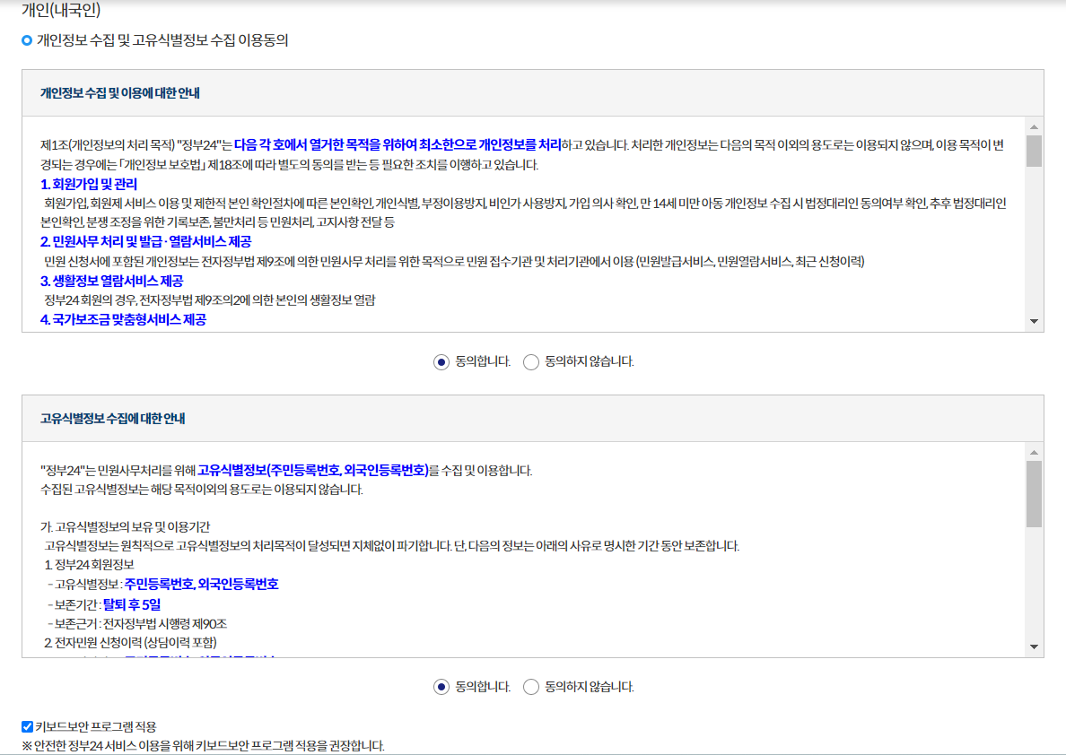 ① 개인정보 수집 및 이용에 대해 모두 동의를 하신 후 하단의 키보드 보안프로그램을 클릭합니다.