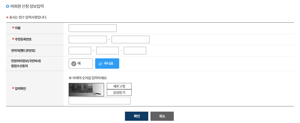 ② 비회원 신청을 위해 성명, 주민등록번호는 필수이며 연락처와 국민비서 알림 수신동의를 하신 후 화면에 나타나는 숫자를 입력하고 확인을 클릭합니다.