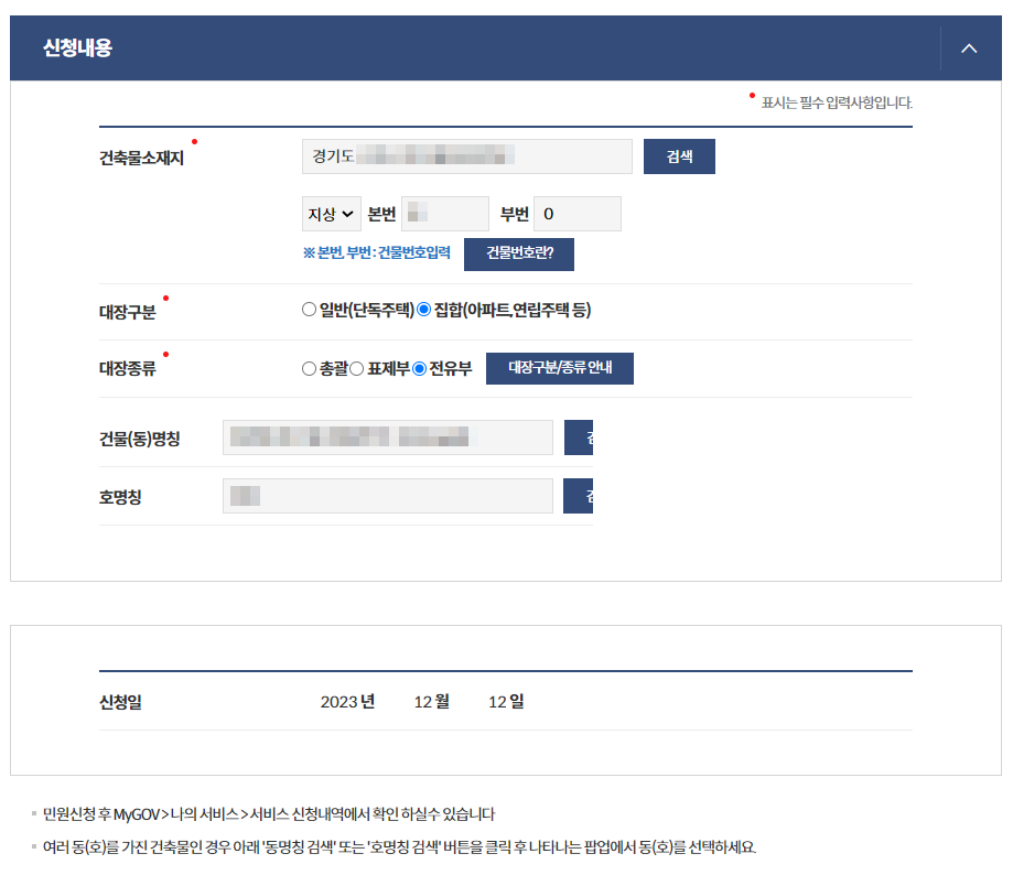 ④ 발급하고자 하는 소재지와 대장구분, 종류, 집합건물일 경우에는 동. 호수까지 입력하여 건축물대장의 발급을 신청합니다.