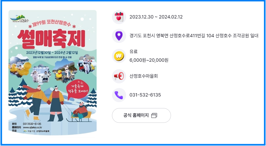 다채로운 볼거리와 즐길거리, 먹거리가 가득한 포천만의 축제에서 산정호수만의 풍경과 더불어 썰매축제체험을 통해 자녀들과 즐거운 시간을 만들어 보시기를 추천합니다.