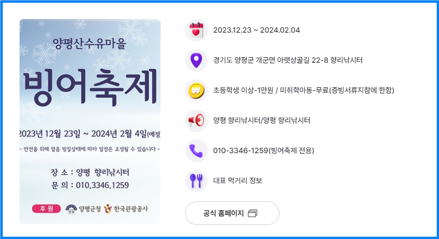 제6회 양평 산수유마을 빙어축제는 2월 4일까지 진행되며 서울에서 1시간 거리에 위치한 6만여 평의 아름답고 광활한 저수지 위에서 축제가 펼쳐집니다.