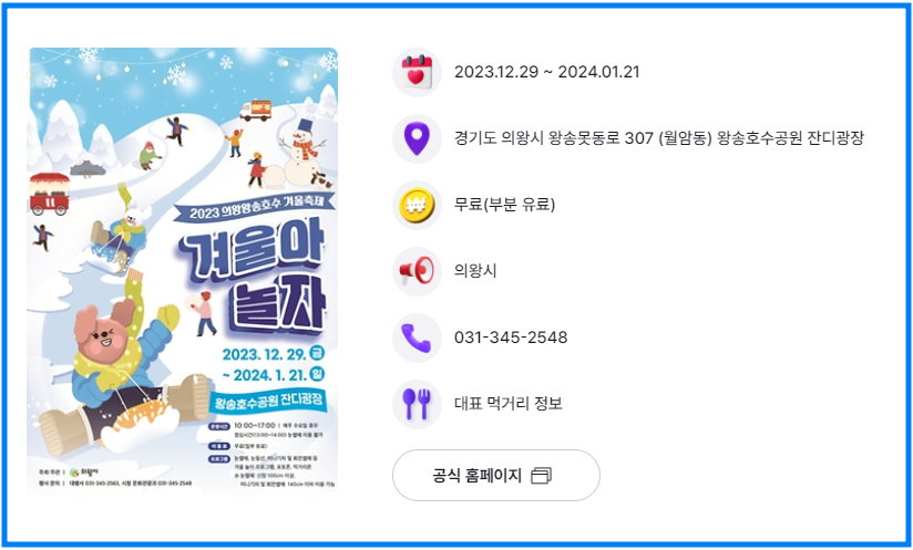 의왕왕송호수 겨울축제는 2016년부터 6년째 이어오고 있는 의왕시의 대표적인 겨울 축제로 23년 12월 29일부터 2024년 1월 21일까지 왕송호수공원 잔디광장에서 펼쳐집니다.