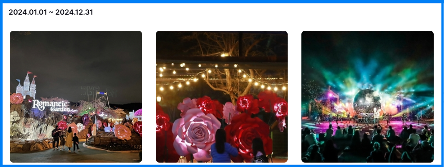 또한 강렬한 음악과 조명, 풀 컬러 레이저가 어우러진 레이저쇼도 관람할 수 있으며 로맨틱가든에서는 웨딩을 테마로 한 가제보와 대형 LED꽃이 형형색색 빛으로 낭만적인 분위기를 연출하며 공원 곳곳 위치한 보름달 실루엣, 초승달 등 다양한 포토존은 관람객들이 인생샷을 남기기에 충분합니다.