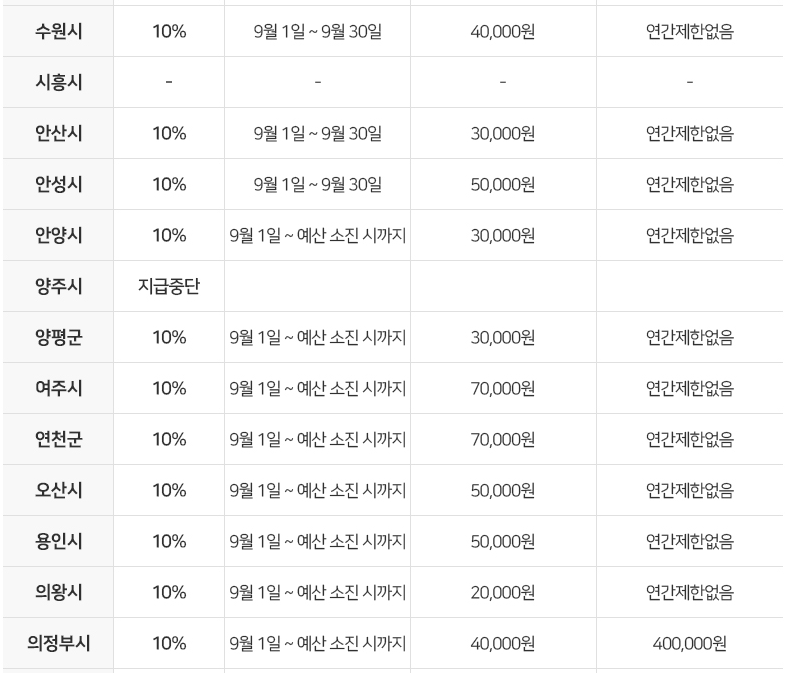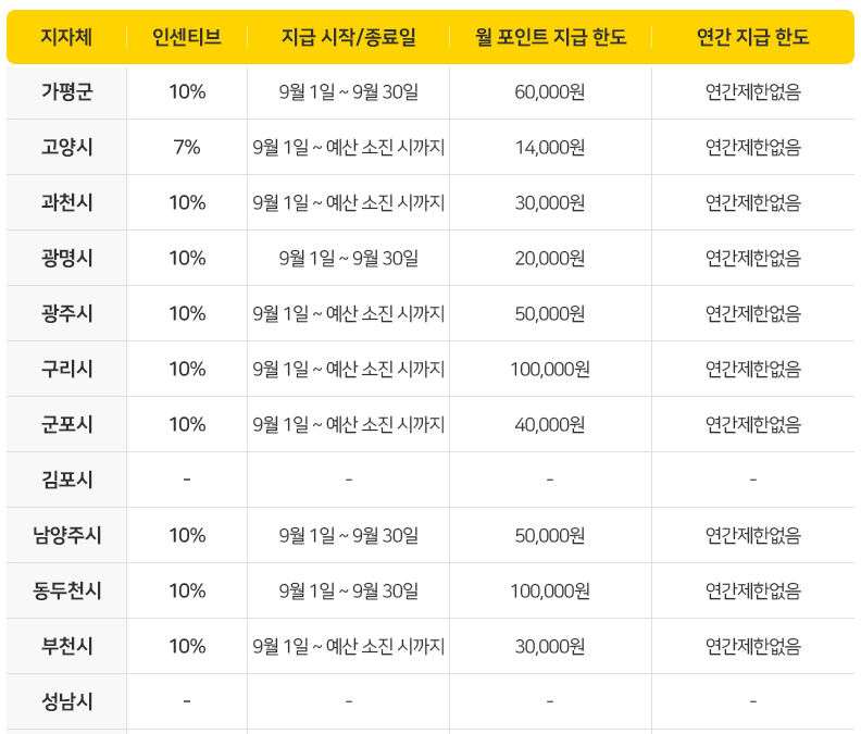 9월 경기지역화폐 인센티브 지급일정 및 한도에 대한 안내를 통하여 지정하신 지역의 월 포인트 지급 한도를 확인하실 수 있으며 구리시와 동두천시 이천시가 월10만원으로 가장 많은 월 포인트를 지급합니다.
