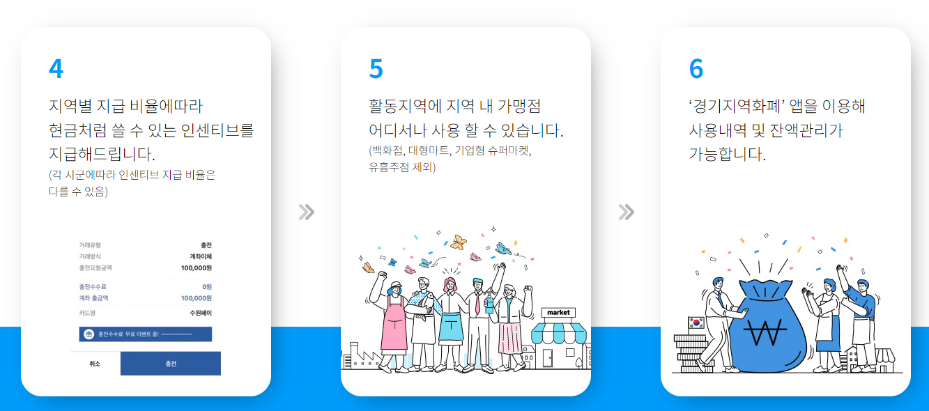경기지역화폐는 경기도민들에 복지 수당을 지급하는 수단으로 경기 지역 자치단체에서 지역경제 활성화를 위해 충전 시 인센티브를 제공하고, 경기도 내 소상공인 매장에서 결제 시 할인을 지원합니다.