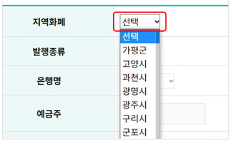 ⑥해당 시, 군을 선택하면 발행종류가 표기되며 지류형 지역화폐 선택 시, 하단 항목사항(은행명, 예금주, 계좌번호, 통장사본)을 입력합니다.
