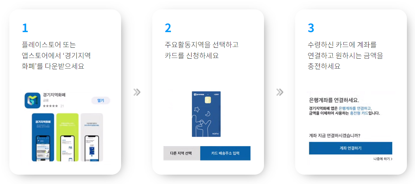 복잡한 계좌 개설이나 은행 방문 없이, 앱에서 경기도 내의 사용하실 지역 카드의 신청이 가능하며 발급받은 카드는 모바일 앱을 통해 언제 어디서나 충전할 수 있으며 번거로운 종이 상품권 대신 카드만 있으면 해당 시. 군 안의 모든 가맹점에서 사용 가능하며 또한 카드 이용 내역은 앱에서 간편하게 확인할 수 있습니다.