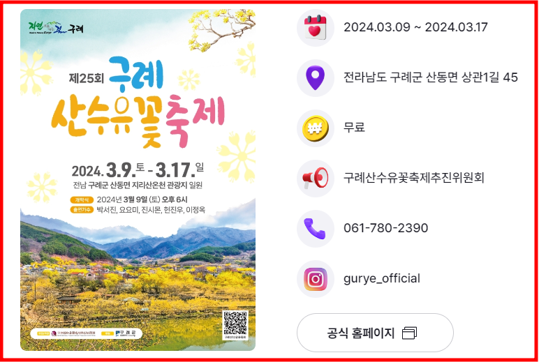 다음에서는 구례 산수유 꽃축제 정보 및 일정과 구례 5대 축제와 봄 추천 여행지를 자세히 소개합니다.