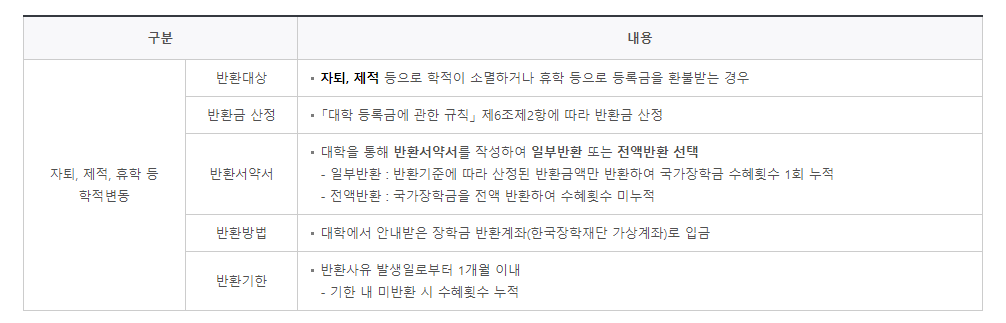 자퇴, 휴학 시에는 지급받은 국가장학금은 반환하여야 합니다.