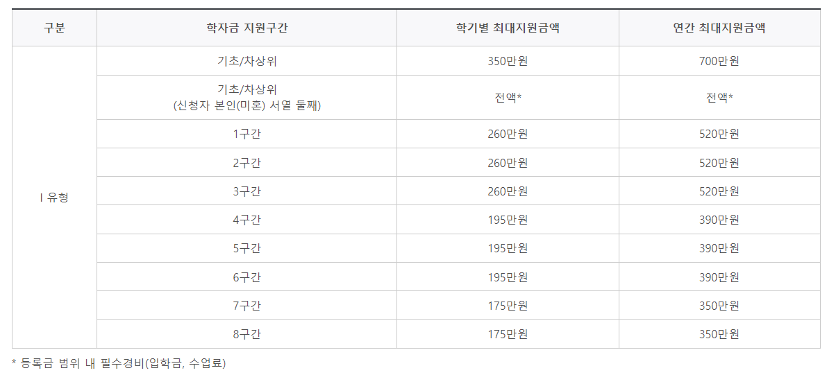 지원금액은 학자금 지원구간별로 해당 학기 등록금 필수경비(입학금, 수업료)를 초과하지 않는 범위 내에서 차등지원 합니다.
