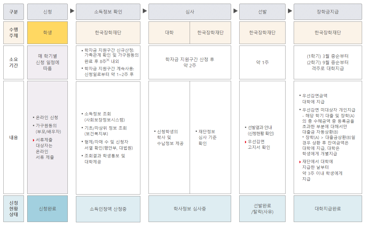 ③ 잘못된 대학명과 학적(신입생, 편입생, 재입학생, 재학생)으로 신청할 경우 심사가 지연되거나 수혜가 불가하며 매년 1학기에 신입생으로 신청할 경우 대학에서 제공한 신입생군 최종등록자 명단을 통해 심사를 진행합니다.