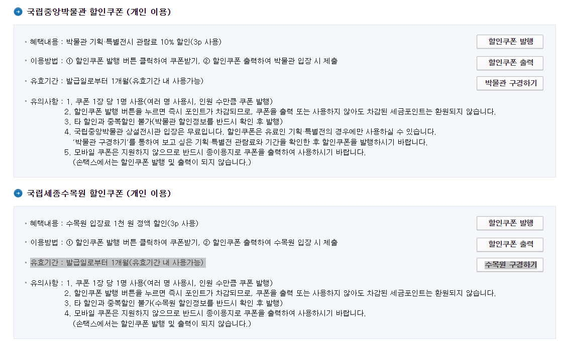 박물관이나 수목원의 이용을 위해 발급받은 쿠폰은 1개월 이내에 사용하셔야 합니다.