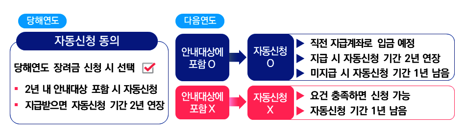 자동신청 제도는 장려금 신청기간에 60세 이상의 고령자 및 중증장애인이 동의하면, 향후 2년 내 신청안내 대상 포함 시 자동으로 신청되는 제도로 자세한 사항은 아래의 표를 참고하시기 바랍니다.