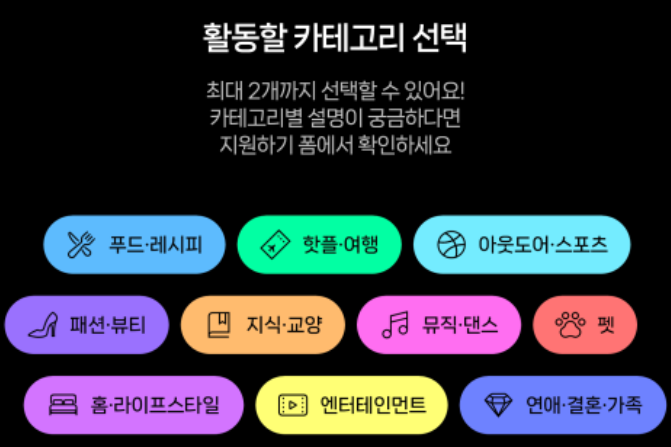 크리에이터는 자신과 연관성이 높은 카테고리를 최대 2개까지 선택할 수 있으며 클립 크리에이터의 활동분야는 기존과 달리 세분화된 것이 특징이며 세분화된 활동분야는 총 10개의 카테고리로 다음과 같습니다.