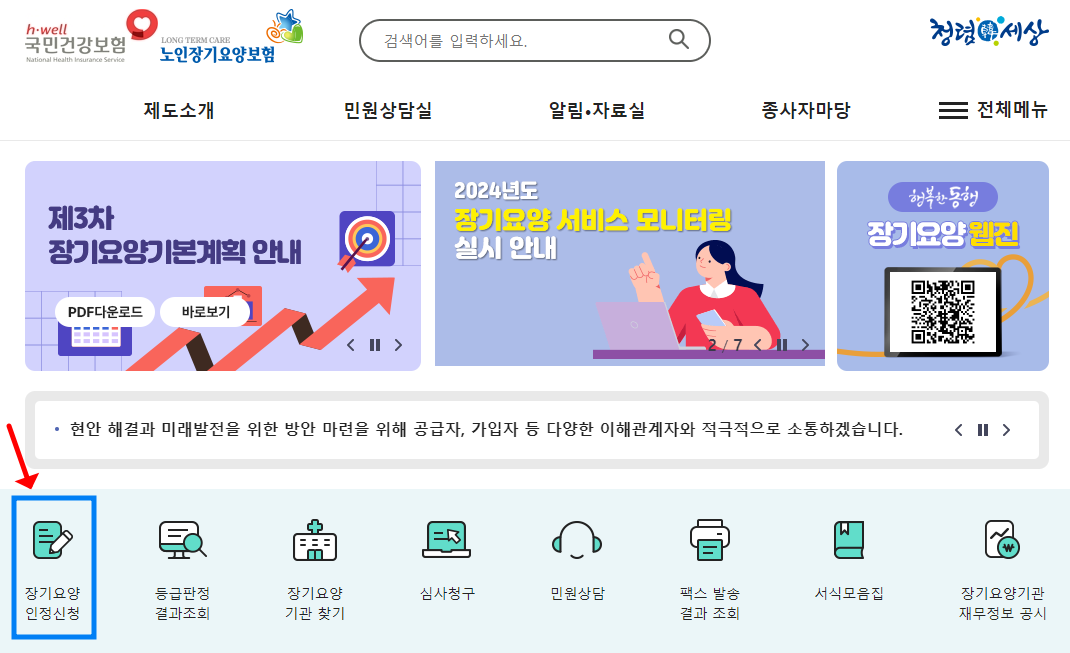 노인장기요양보험의 인정 신청은 국민건강보험공단 홈페이지에서 신청이 가능하며 아래사진의 파란 박스를 통해 신하시면 됩니다.