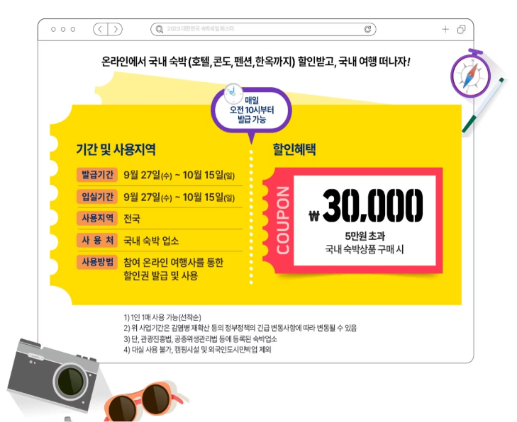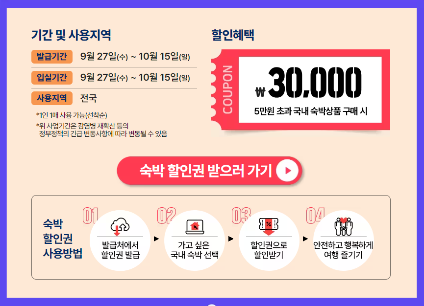 ① 숙박할인권의 발급 및 예약 기간 : 2023년 09월 27일(수) ~ 10월 15일(일)