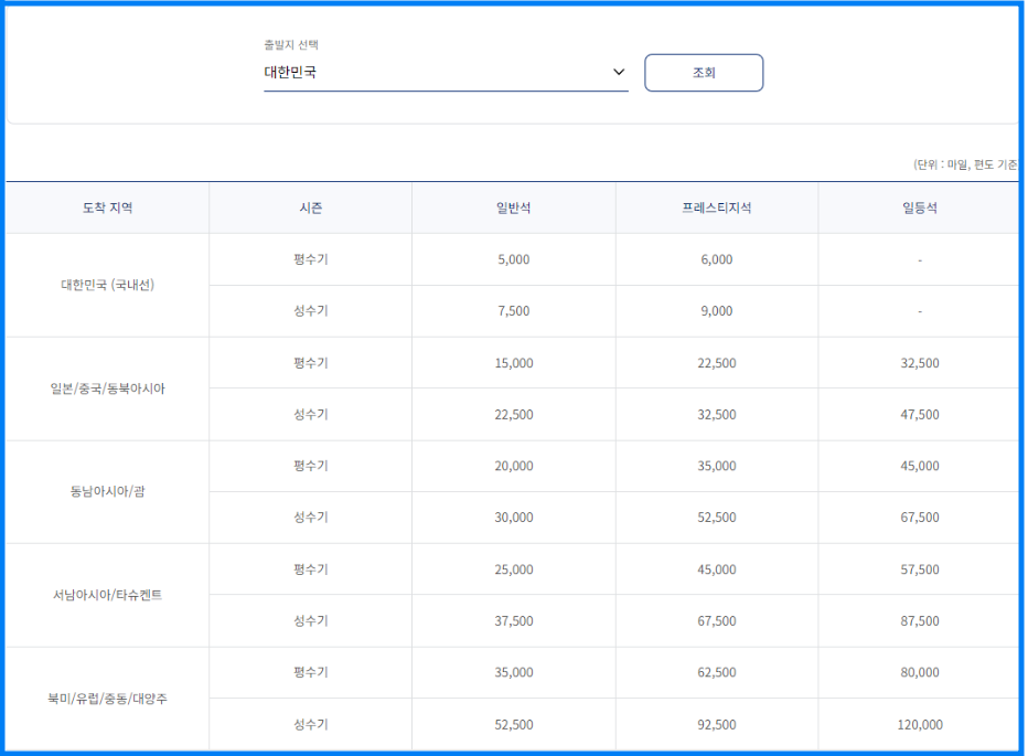 ▶ 대한민국 출발 및 도착 여정의 경우 각 구간 탑승일 기준으로 성수기 마일리지 적용됩니다.
