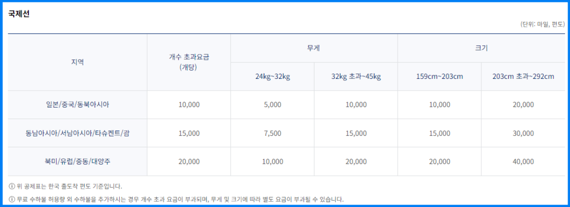 국내선의 무료 수하물 허용량 초과 시 1kg당 200 마일리지가 공제되며 국제선의 지역 별 수하물 공제는 아래의 표와 같습니다.