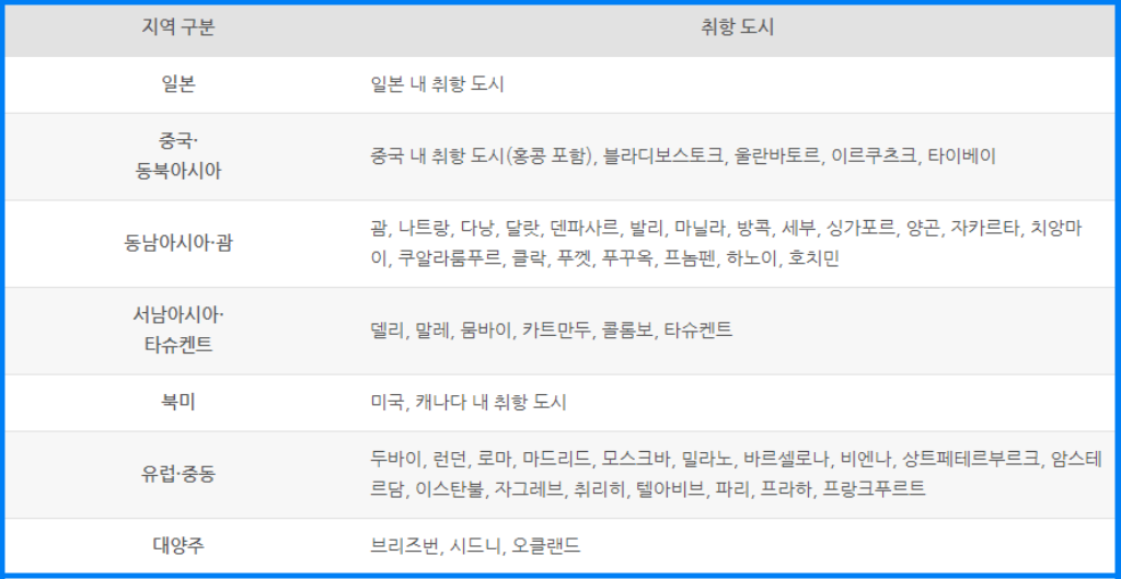 세부적인 지역 및 취항 도시는 아래와 같습니다.