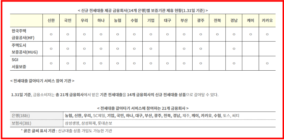 ② 대환대출 금융회사 : 1월 31일 기준 총 21개의 금융회사가 대환대출 서비스에 참여하고 있으며 신규 전세대출이 가능한 금융기관은 총 14개 기관으로 아래의 표에서 확인이 가능합니다.