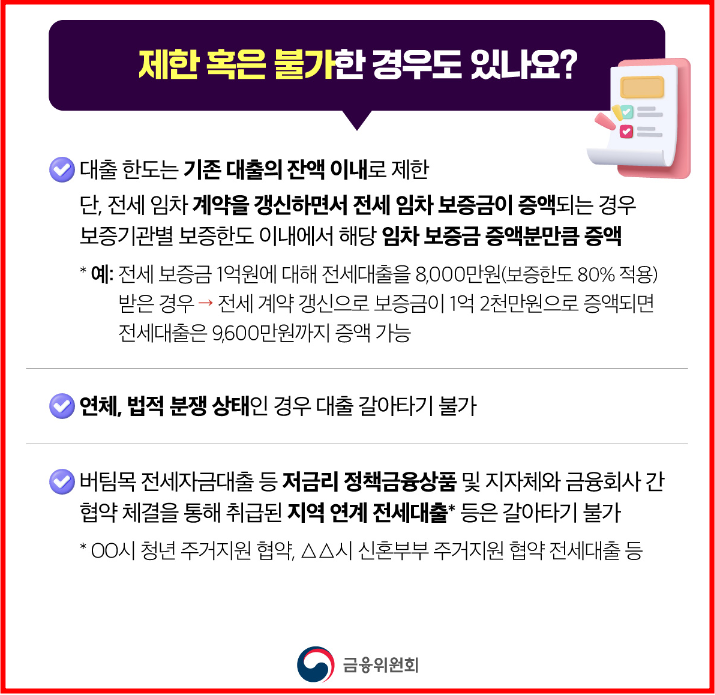대환대출의 한도는 기존 대출의 잔액 이내로 제한되면 전세임차계약 갱신으로 인한 보증금이 증액 시에는 보증금의 증액분 만큼만 대출 한도가 됩니다.