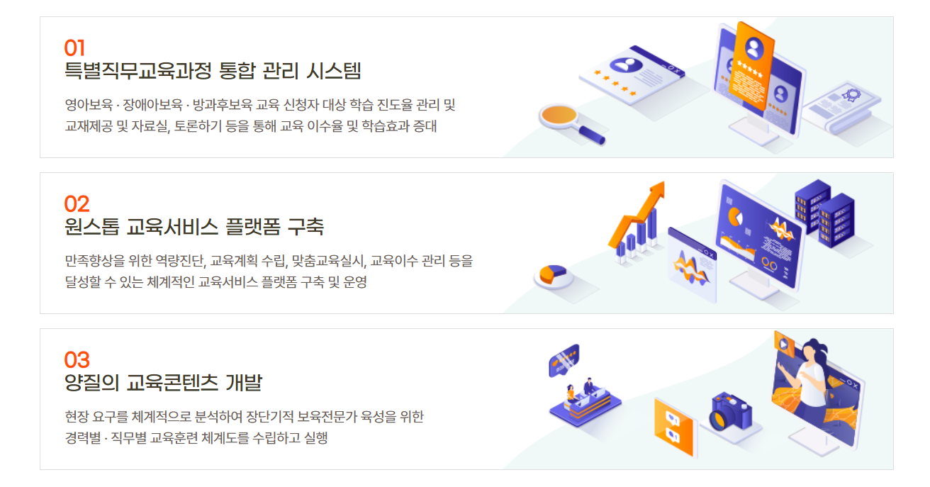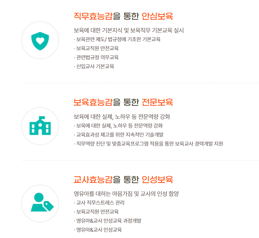 보건복지부의 보육교직 온라인 보수교육 위탁기관, 행정안전부의 어린이 안전교육 지정 교육기관이며 고용노동부의 안전보건교육 및 장애 인식 개선교육 지정 교육기관이기도 합니다.