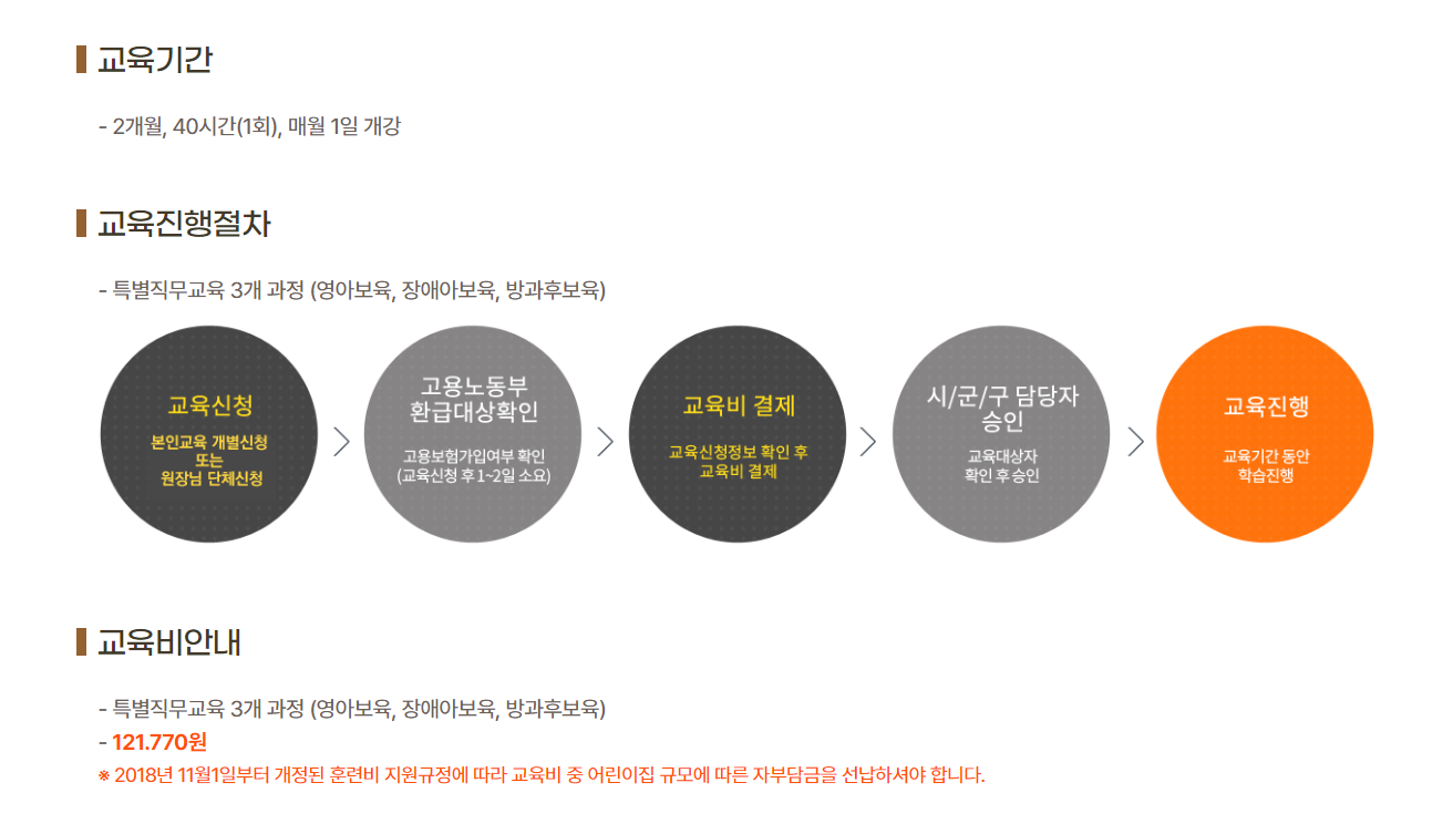 교육진행은 특별직무교육 3개 과정으로 영아 보육, 장애아 보육, 방과 후 보육 과정이 있으며 교육 이수를 위한 기준은 진도율 100%와 시험환산점수 총점 60점 이상이어야 수료 가능합니다.