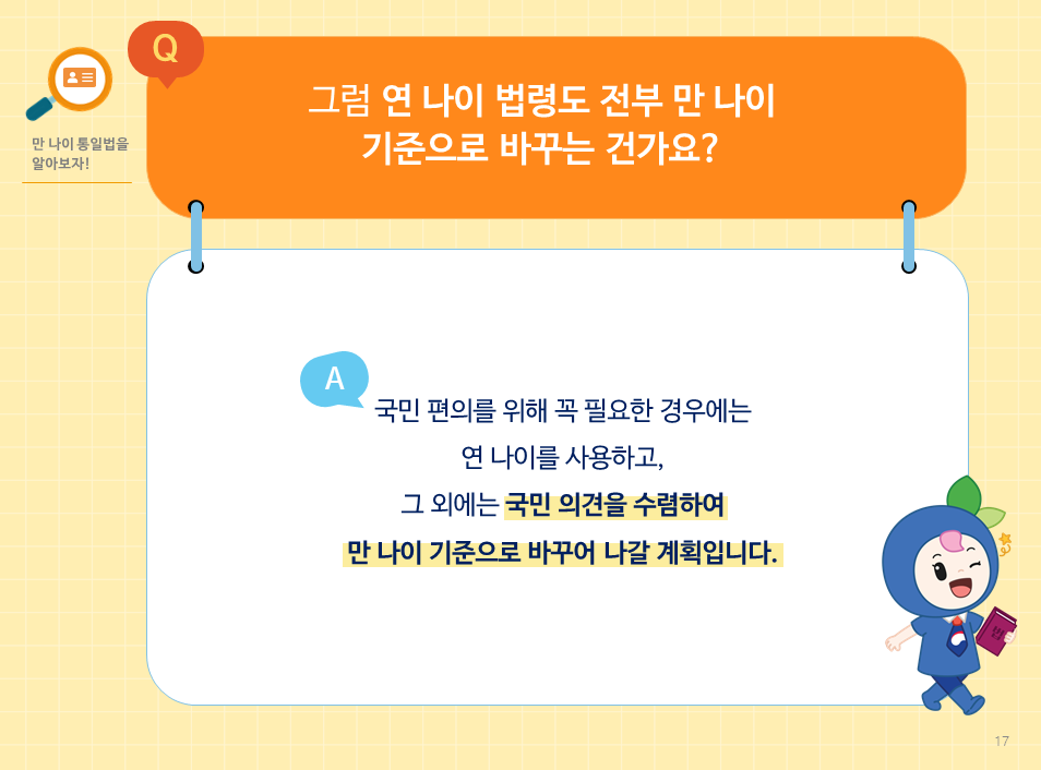 법제처에서는 연 나이 법령을 전부 만 나이 기준으로 바꾸는 것은 국민 편의를 위해 꼭 필요한 경우를 제외하고는 연 나이를 사용하고 그 외에는 국민 의견을 수렴하여 만 나이 기준으로 바꿀 계획이라고 하는데 저의 소견으로는 나이 적용 방법을 모두 통일하는 게 어떨까 싶습니다.