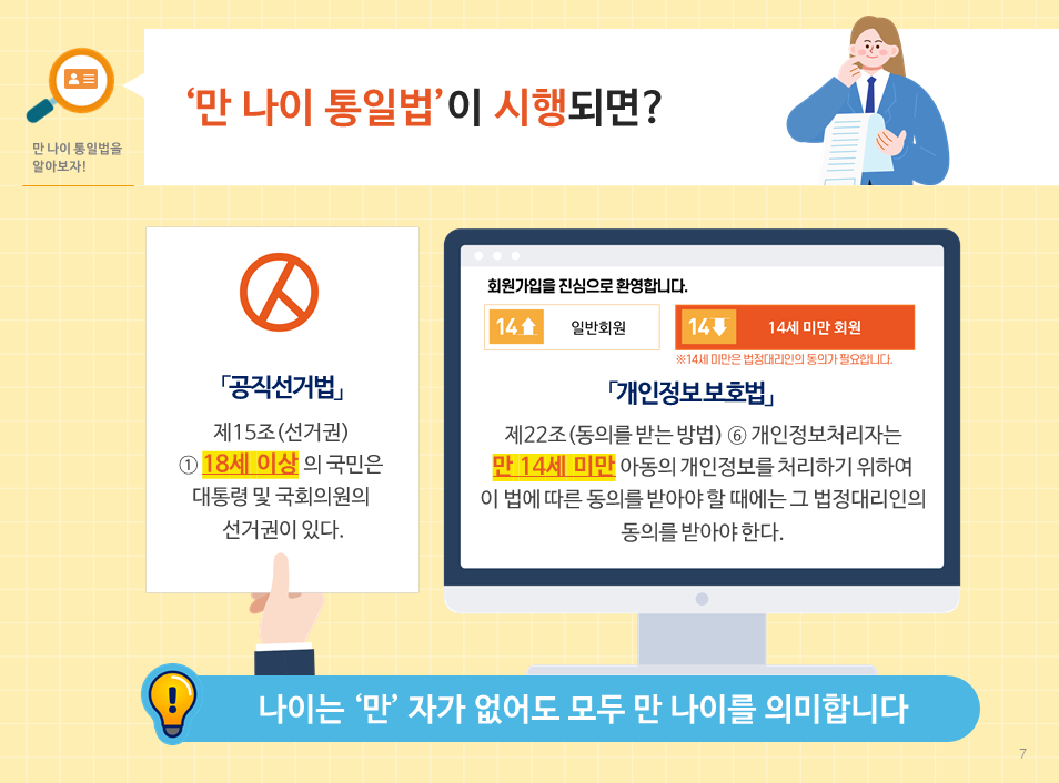 ▶만 나이 통일법이 시행되면 공직선거법상의 18세 이상의 대통령 및 국회의원의 선거권이 부여되며, 개인정보 보호법 제22조의 의거 만 14세 미만 아동의 개인정보 처리를 위한 동의는 법정대리인의 동의를 받아야 합니다.
