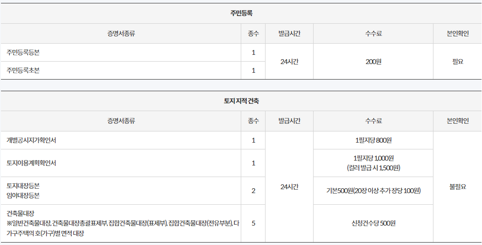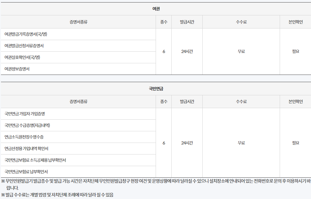 무인민원발급기에서의 발급 가능 증명서는 주민등록, 토지지적 건축, 차량, 보건 복지 등 다양하며 발급시간 및 수수료는 각 지방자치단체의 조례에 따라 다를 수 있습니다.