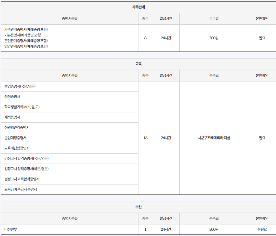 무인민원발급기 발급가능 증명서