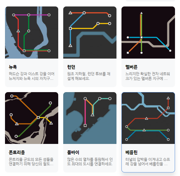 세계 19개국의 30개 도시를 대상으로 도전하는 게임인 미니 메트로 게임의 Map은 실제 지형이 반영되어 있으며 강을 접하고 있는 도시는 많은 터널을 필요로 하기때문에 난이도가 올라 갑니다.