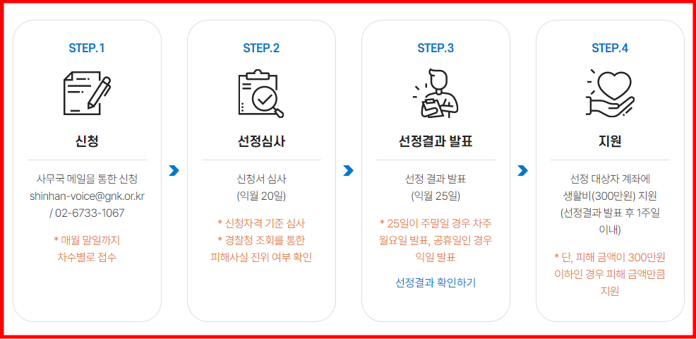 보이스피싱 피해자를 위한 지원절차는 사무국 메일을 통해 매월말 접수된 신청서를 토대로 신청자격 기준 및 피해사실 진위여부를 확인하여 선정결과를 발표하며 선정 대상자는 선정결과 발표 후 1주일 이내에 피해금액(최대 300만 원) 범위 내에서의 생활비를 지원받을 수 있습니다.