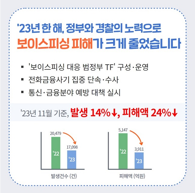 정부와 경찰의 노력으로 23년 11월 기준 발생건수는 14% 감소하였으며 5,100억 원 이상의 피해액 또한 3,900억 원으로 24% 감소하였습니다.