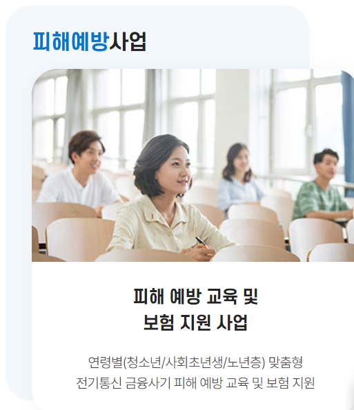 만 14세 이상의 보이스피싱 피해예방 교육 수료자를 대상으로 보험 지원사업을 통해 연령별 맞춤형 보이스 피싱 피해예방 교육과 더불어 보험가입 희망자에 한하여 교육일로부터 1년간 전기통신 금융사기피해 및 착오송금 회수비용 프로그램 보험료를 지원합니다.