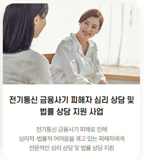 전 국민을 대상으로 한 전기통신 금융사기 및 인식개선 캠페인을 운영 중인 보이스 피싱 제로사업을 통해 피해를 입은분들에게 생활비 지원과 더불어 심리 및 법률상담을 통해 빠르게 일상으로 돌아갈 수 있도록 지원하는 사업으로 입니다.