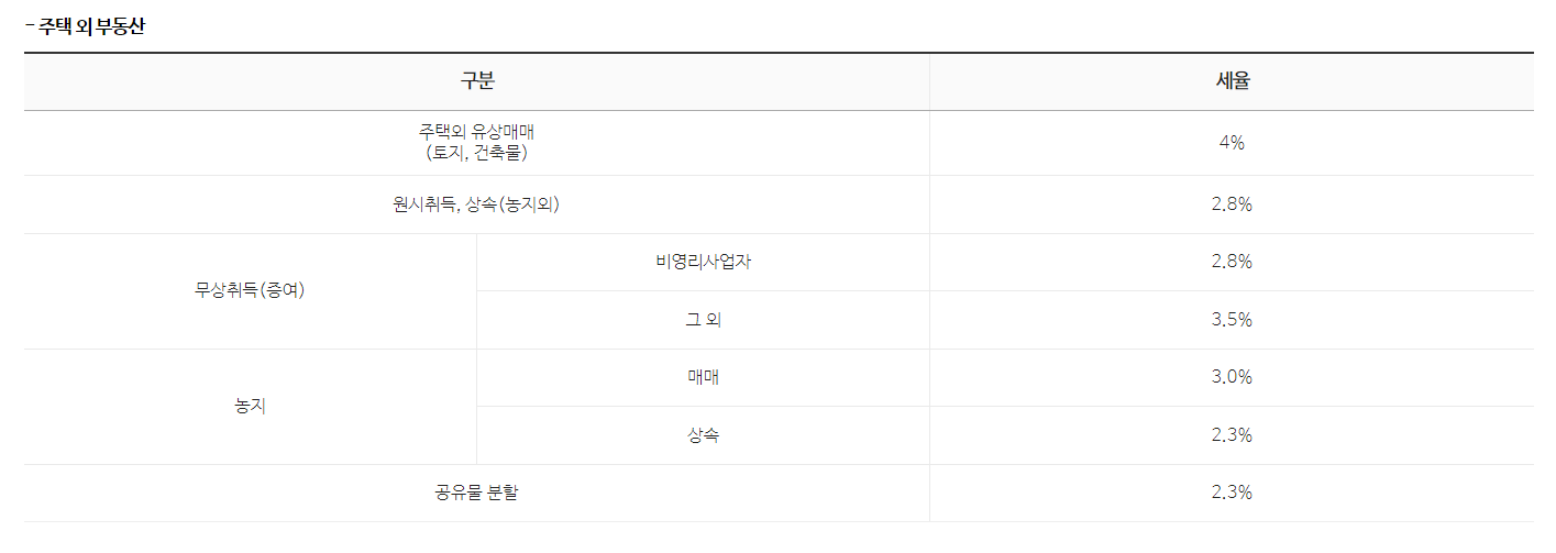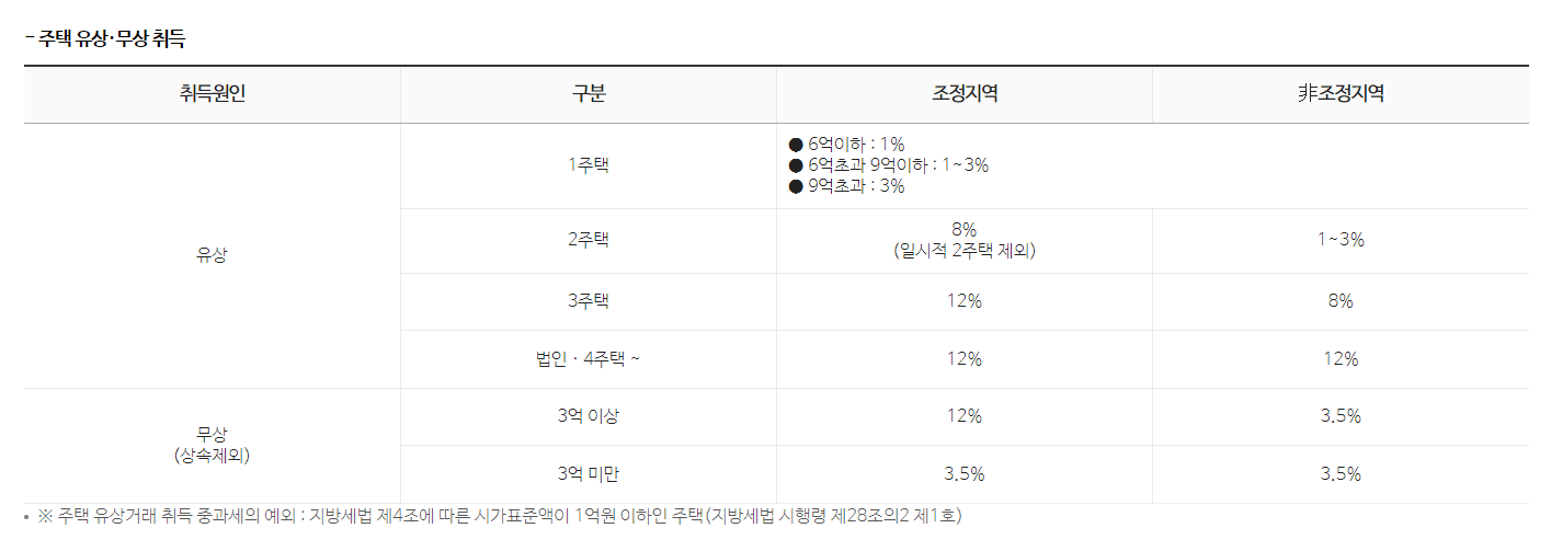 주택의 유상 및 상속을 제외한 무상취득과 주택 외 토지와 농지등의 부동산의 취득으로 발생하는 지방세율은 구분 및 조정지역에 따라 적용하는 세율의 차등은 아래 표를 참조하시기 바랍니다.