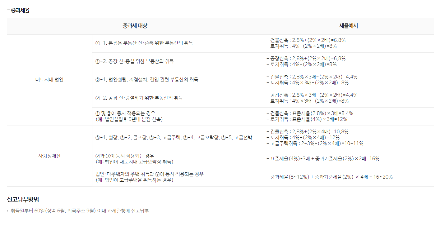 또한 토지의 지목변경이나 과점주주 주식취득, 선박·차량·기계장비의 종류변경, 건축물 개수 등의 간주취득에도 취득세가 과세됩니다. 사치성재산으로 분류되는 별장, 골프장, 고급주택, 고급 오락장, 고급선박과 대도시 내 법인이 취득하는 일정 부동산 취득에 대해서는 중과세를 적용합니다.