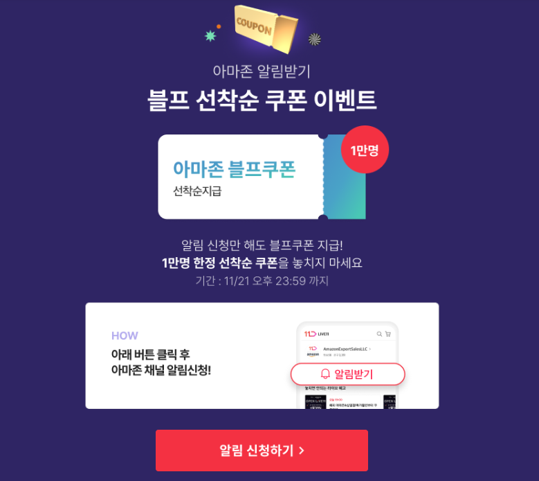 또한 1만 명을 대상으로 매일 아마존 블프쿠폰을 선착순으로 지급할 예정이니 쿠폰 수령을 위해서 아래에서 아마존 채널 알림 신청을 하시기 바랍니다.