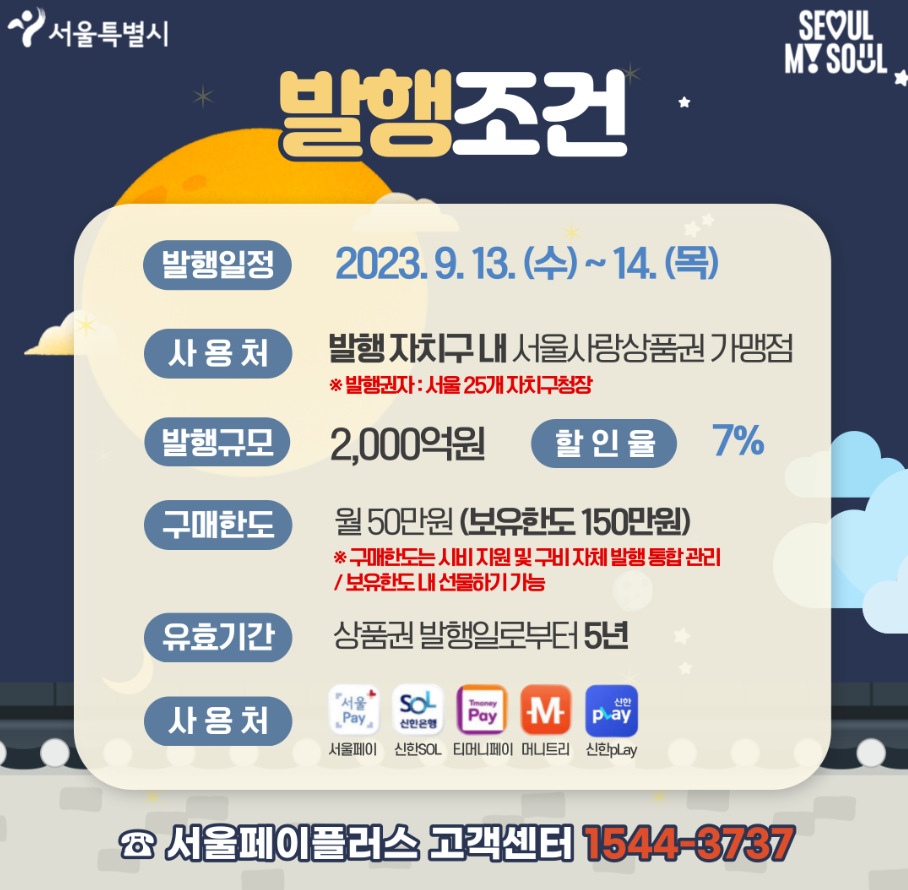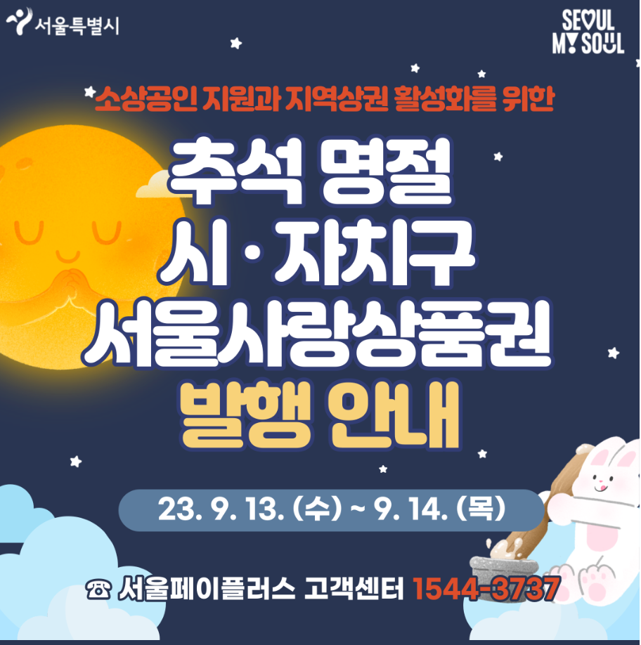 추석명절 소상공인 지원과 지역상권 활성화를 위하여 서울시에서는 추석명절 서울사랑상품권을 9월 13일과 14일 이틀에 걸쳐 서울페이플러스(1544-3737)를 통해 발행합니다.