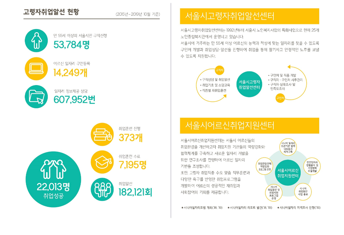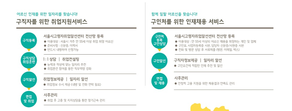 서울시고령자취업알선센터 전산망에 구직을 원하는 시니어의 취업지원등록서비스와 구인처를 위한 인재채용 서비스를 통하여 시니어들의 일자리를 연결해 드리는 서비스를 지원하고 있습니다.
