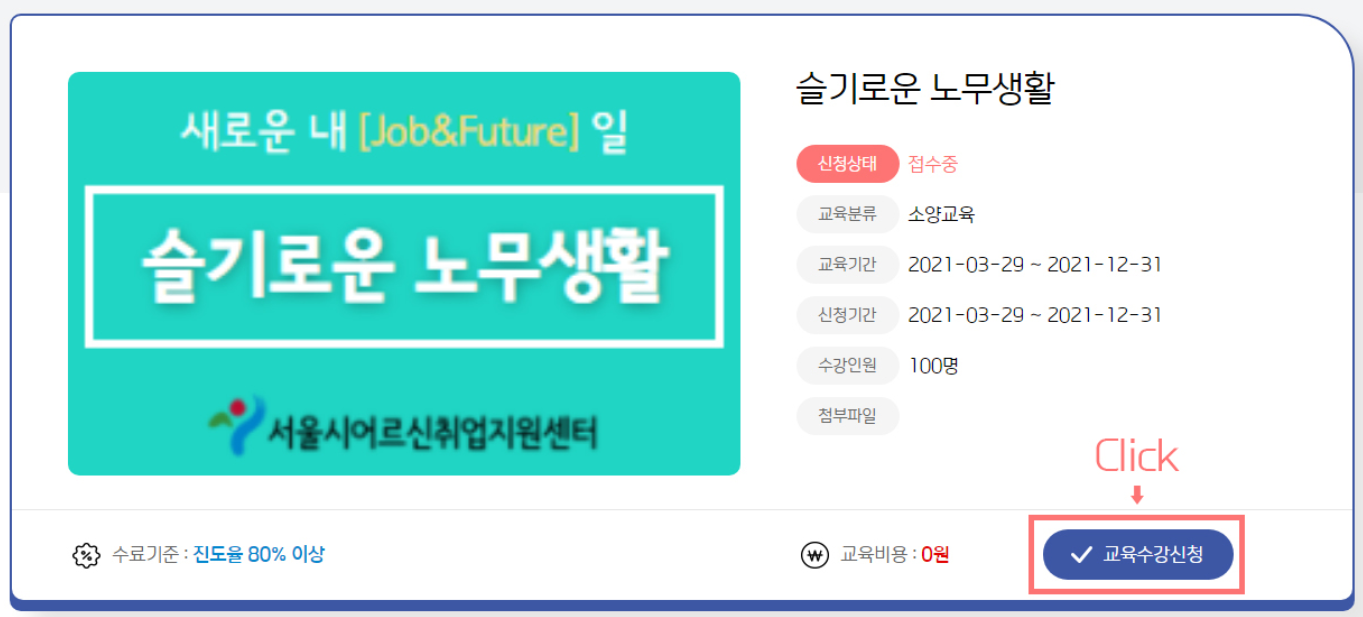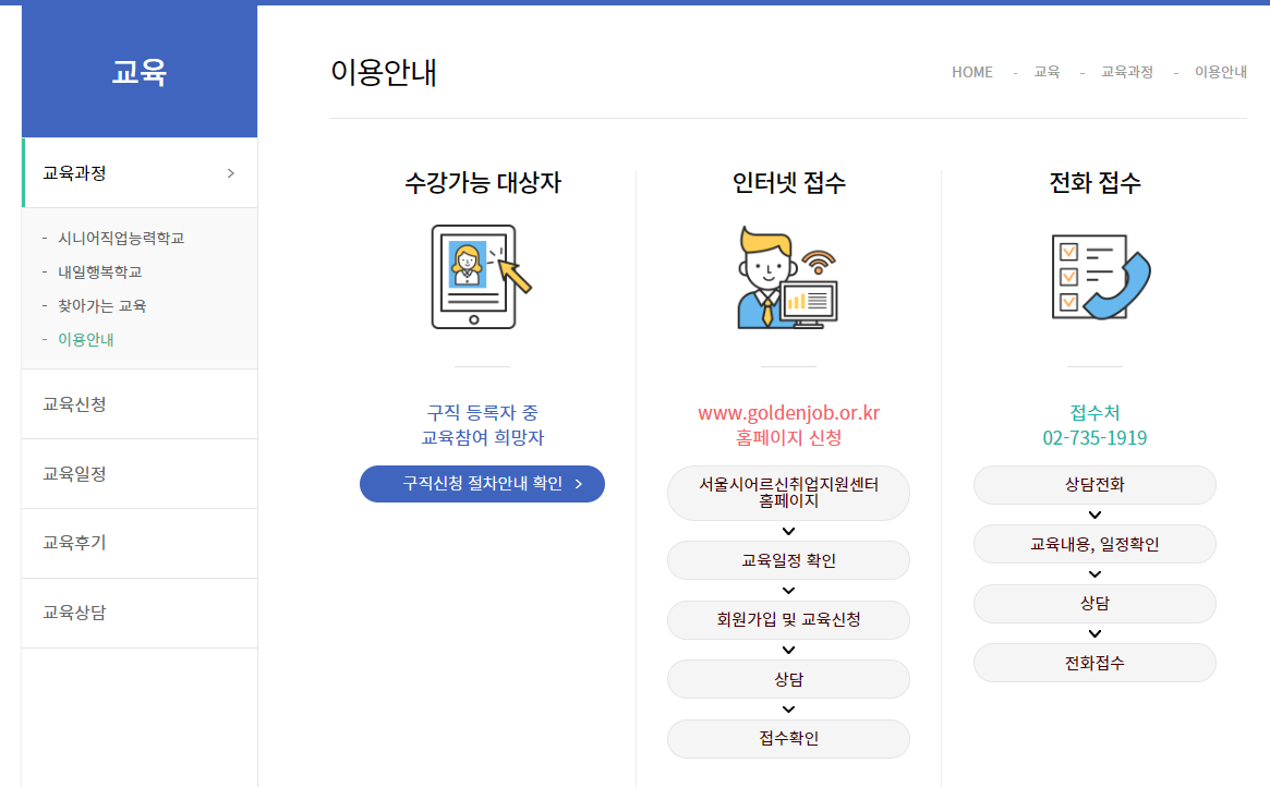 참고로 아래 첨부한 교육의 신청기간은 올해 연말까지로 나와있지만 서울시어르신취업지원센터에 들어가 보니 접수가 완료된 교육으로 나옵니다. 원하시는 교육의 종류 및 일정은 인터넷 서울시어르신취업지원센터를 방문하셔서 신청하시기 바랍니다.