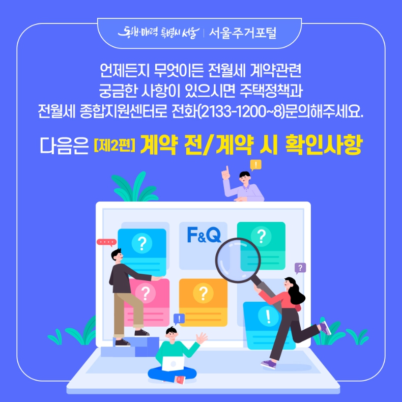 좀 더 궁금하신 내용은 전, 월세 계약 시 반드시 체크하여야 할 사항을 알려주는 주택정책과 전월세종합지원센터로 문의하시면 됩니다.