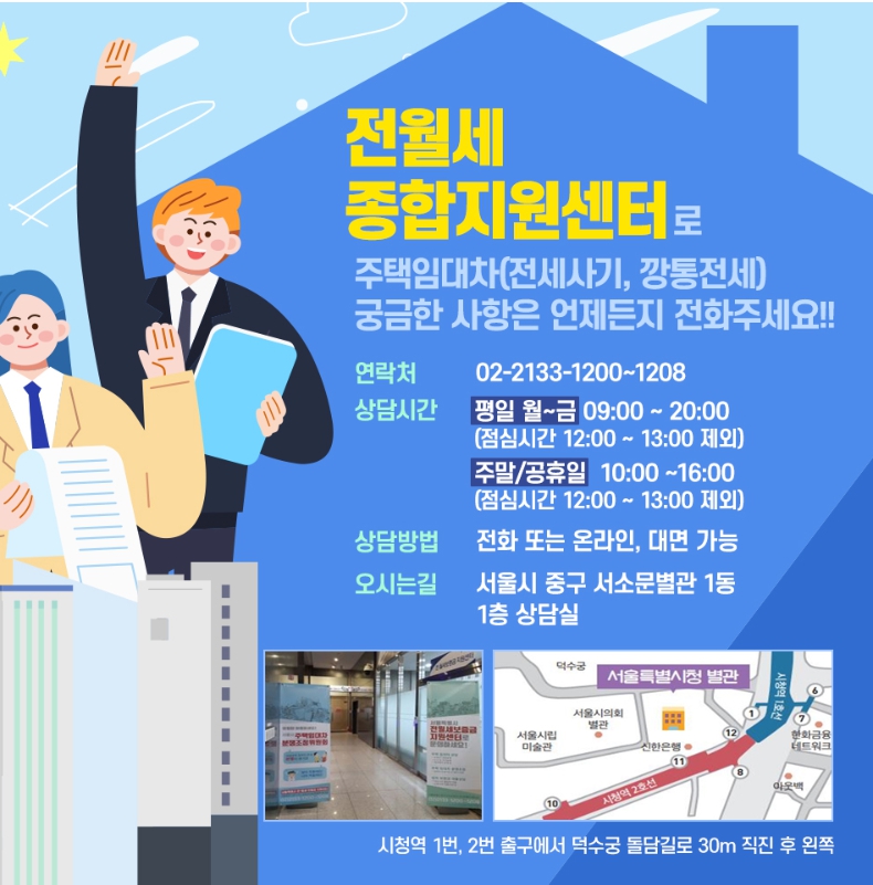 전월세 종합지원센터 통합접수는 서울시 중구 서소문별관 1동 1층 상담실 02-2133-1200~8로 연락하셔서 상담을 받으시면 됩니다.